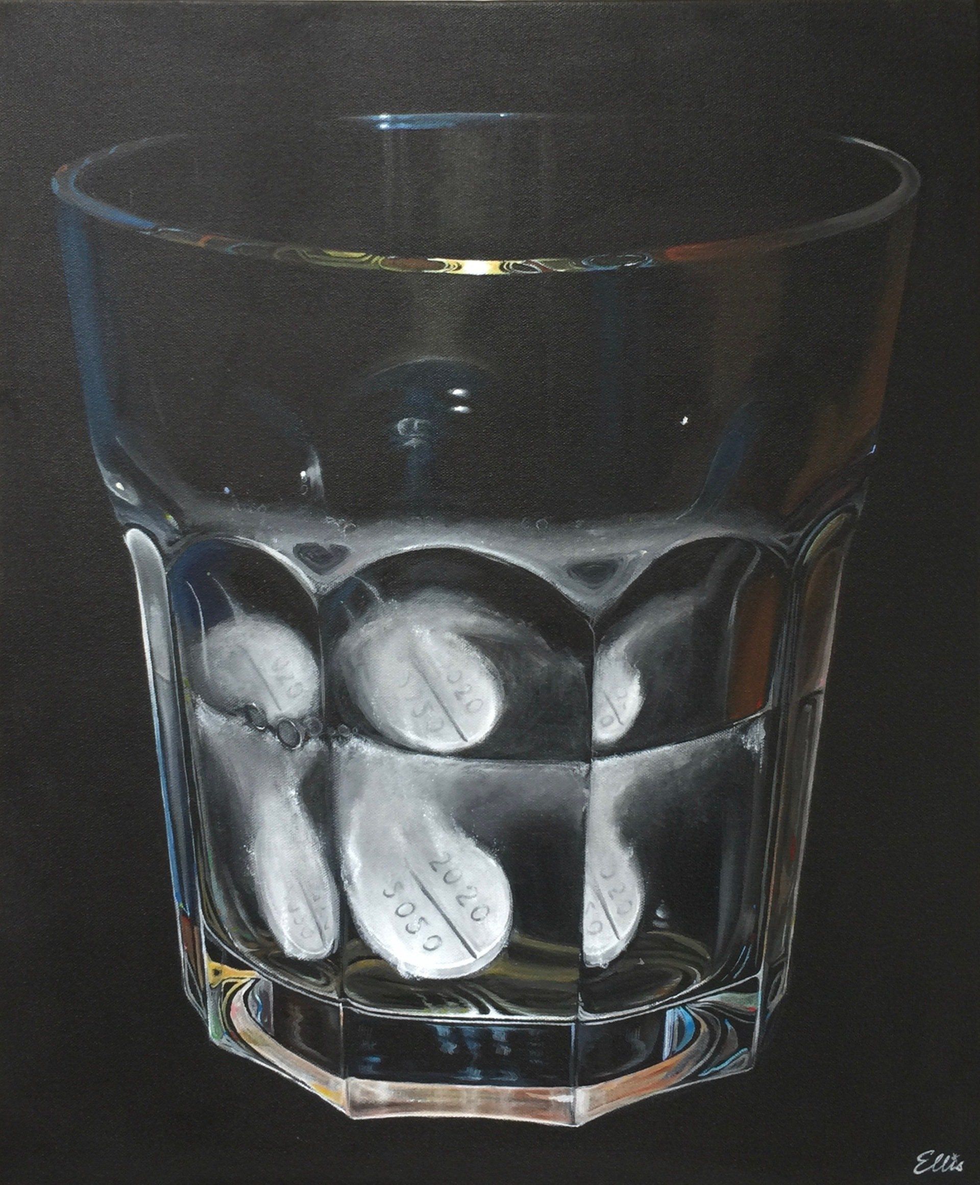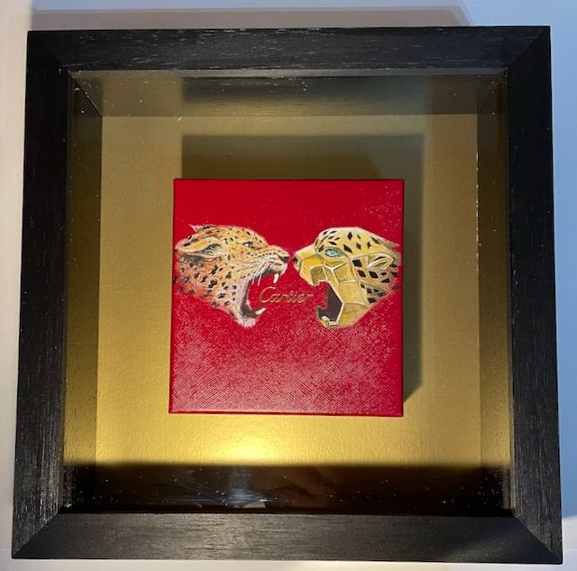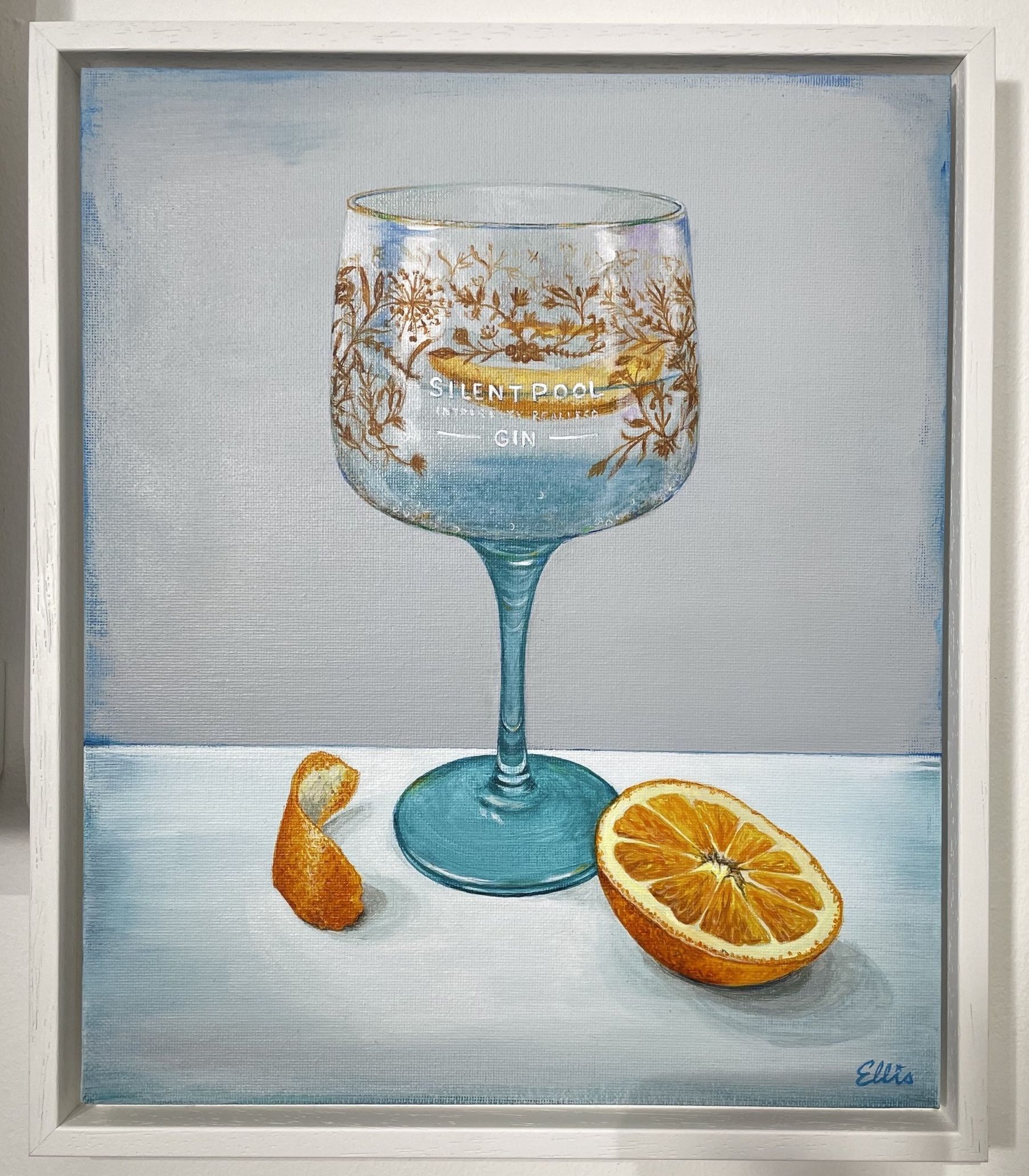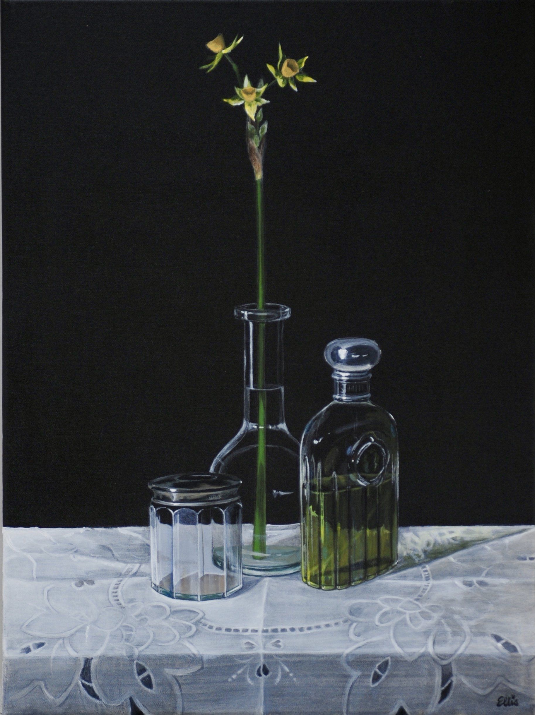 6 perfume bottles (Chloe, Dior etc)with cocktail jewellery, reflected in the black glass table. Acrylic on fine grain cotton canvas, signed. Professionally framed in tonal grey wooden 'floating' frame.