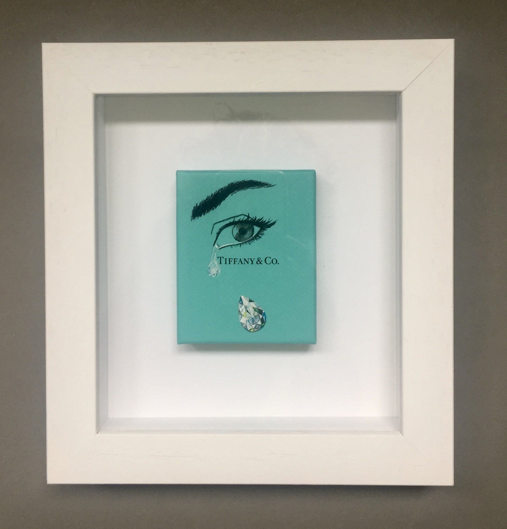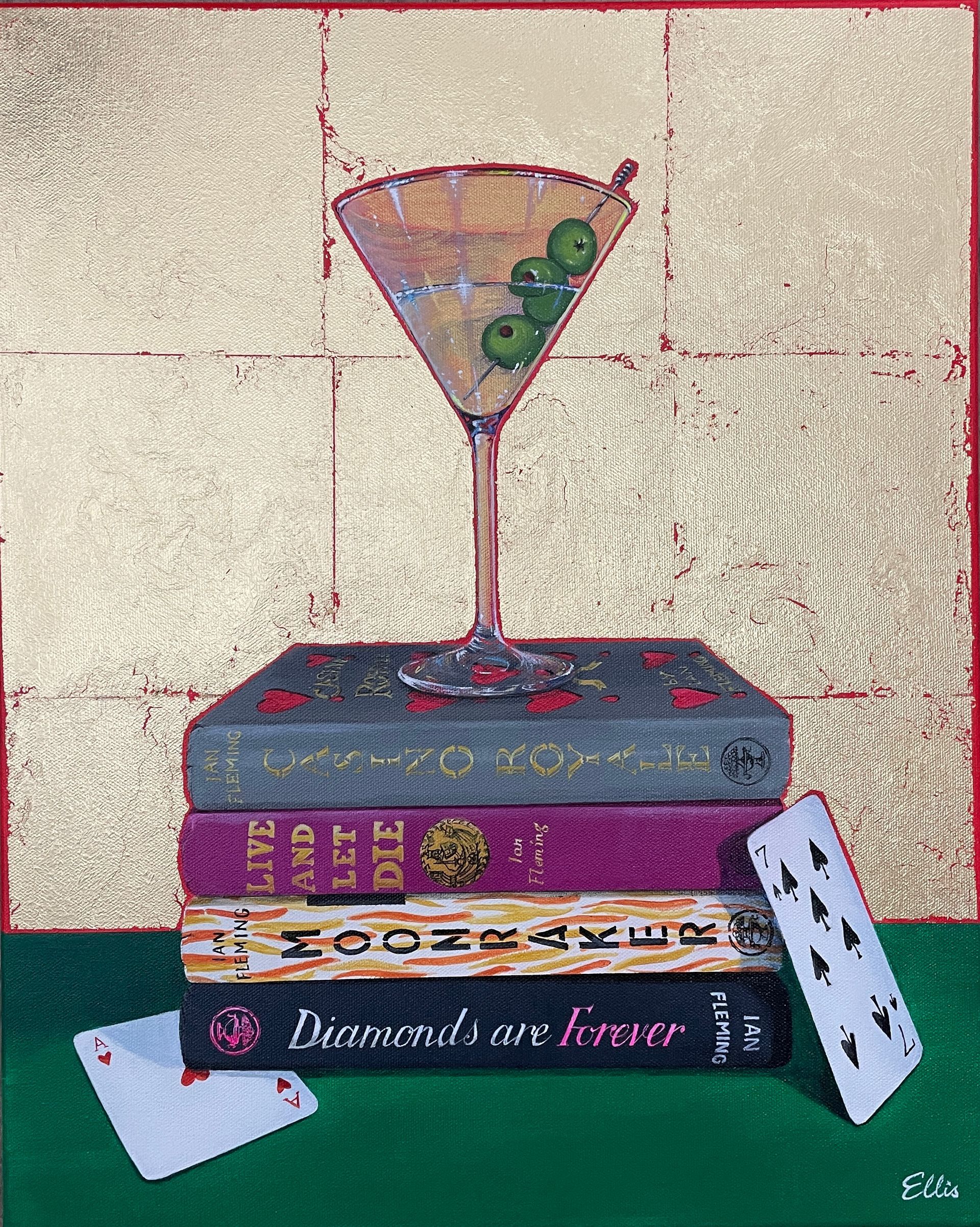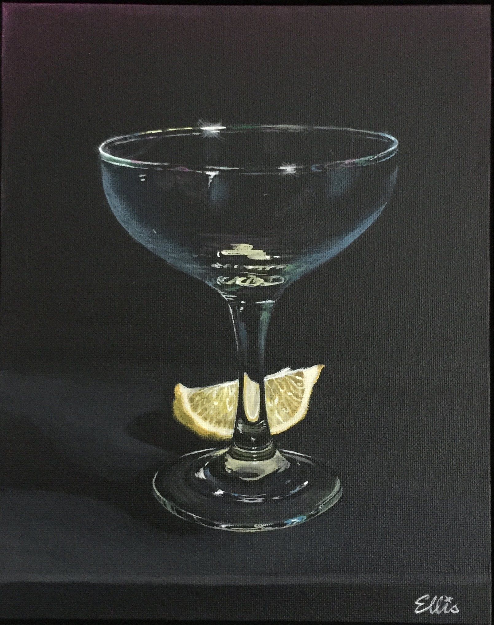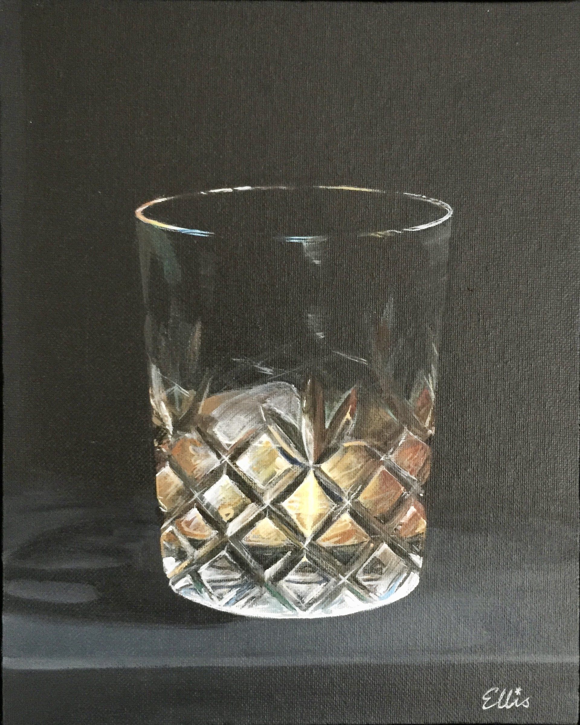 6 perfume bottles (Chloe, Dior etc)with cocktail jewellery, reflected in the black glass table. Acrylic on fine grain cotton canvas, signed. Professionally framed in tonal grey wooden 'floating' frame.