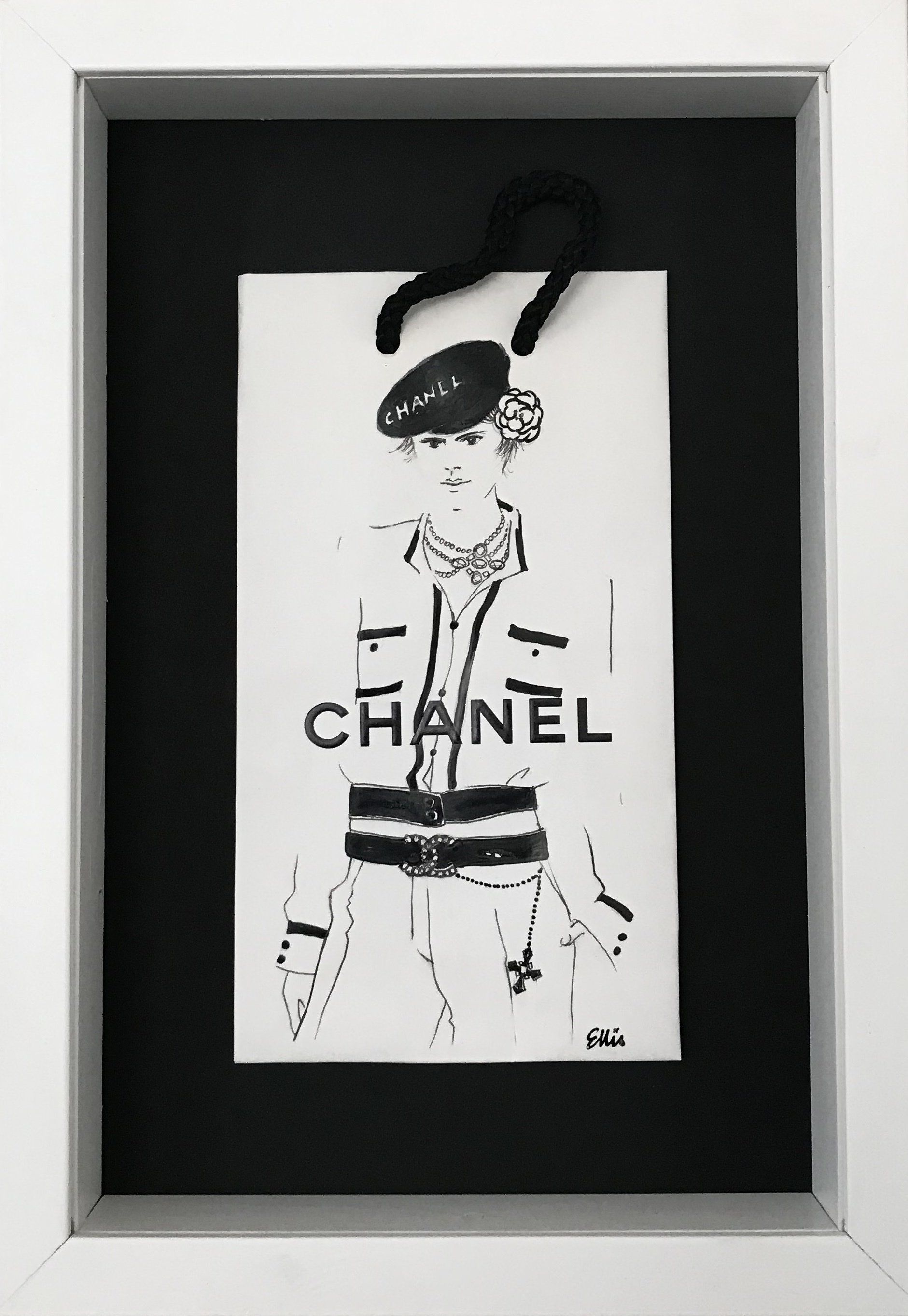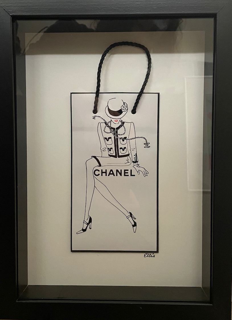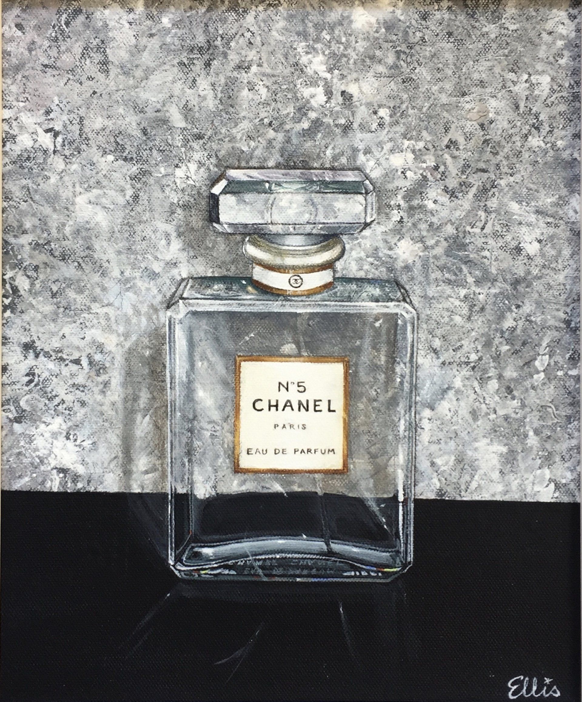Coco Mademoiselle perfume delicately painted on warm grey background. Acrylic on cotton canvas. Unframed, signed